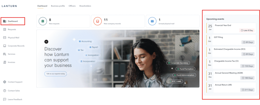 You can view requests, records, upcoming events, unread mail, and deadlines like Financial Year End (FYE), Annual General Meeting (AGM), and Annual Return (AR).