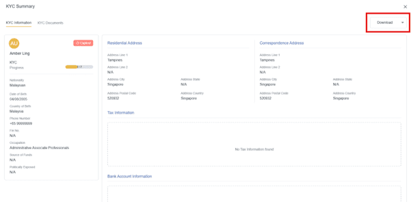 Yes, you can generate KYC profiles for specific investors, including identification documents and KYC-related documentation. Historical reporting documents (Foreign Account Tax Compliance Act (FATCA)/Common Reporting Standards (CRS) submissions and MAS-related filings) are also accessible and downloadable.