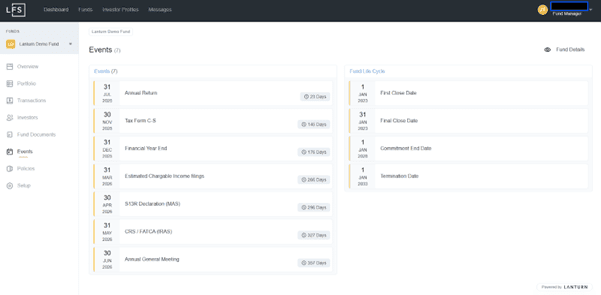 The platform features a built-in event calendar for scheduling and managing important regulatory deadlines, including filing due dates, license renewals, and regulatory surveys like those required by Monetary Authority of Singapore (MAS).